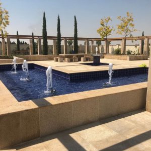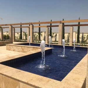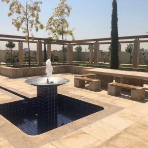 Zwischen den Jacarandas, eingerahmt von imaginären Fenstern in der Ost Mauer, ergießt sich aus der Wand ein silberner Wasserfall in das halbrunde Granitbecken. Von dort strömt ein blauer Bach im hellen Pflaster nach Westen in die Mitte des Zentralen Platzes und steigt in einem erhabenen Schalenbrunnen empor.