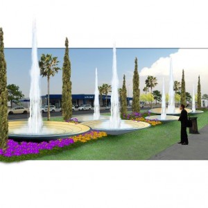 - der von großen Brunnenschalen dominierte Empfangsbereich der Flughafenpassagiere „meet & greet“
