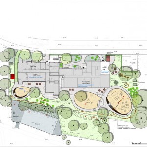 Grundidee der Gestaltung sind ineinanderfließende kleine Terrassenräume, die über die gesamte Länge des Baukörpers alle Gruppenräume mit Außenbereichen verbinden. Der relativ enge Zuschnitt des Grundstücks zwang uns die einzelnen Funktionsräume in diese Terrassenflächen zu integrieren. Im Bereich der Krippe (Kinder von 1 bis 3 Jahren) liegt der Schwerpunkt auf einer Sandfläche mit einem gering erhöhten Umlauf von dem über eine flache, breite Rutsche in eine Sandfläche gerutscht werden kann. Ein vergleichbares Element, jedoch mit einer stärkeren Geländemodellierung und einer größeren Ausdehnung befindet sich im Bereich des Kindergartens. Entsprechende den Altersstufen ausgebildete Kletter- und Balancierpfade liegen unterhalb der Baumtraufen und sind sehr gut beschattet. Weidendickicht und eine Holzplattform vervollständigen das spielerische Ensemble, so dass auch hier auf relativ geringem Raum unterschiedliche Teilbereich geschaffen werden und gleichzeitig den motorischen Ansprüchen der Kinder maximal Rechnung getragen werden kann. Eine Bobby-Carbahn umrahmt die zentrale Sandspielinsel und erschließt alle anschließenden Spielbereiche.