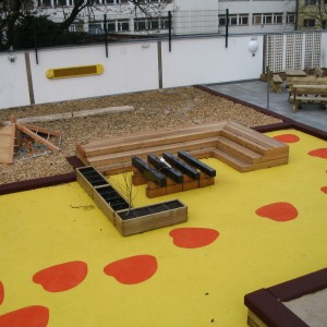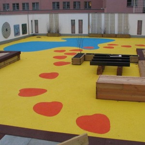 Wir haben dann anschließend einen Entwurf für die Gestaltung der Dachfläche entwickelt und abgestimmt. Dabei legten wir viel Wert auf funktionsgerechte und ansprechende Oberflächenform mit verschiedenfarbiger zweischichtigen Kunststoffoberfläche von Playfix. So konnten wir farbig Wege und Räume darstellen, in denen dann durch leichte Aufbauten, wie Sandkasten, Kletterpodest, niedrige Spielgeräte etc. „mobile“ Objekte für die Ausstattung sorgten. Diese Objekte brauchten nicht verankert zu werden, was bautechnisch die einzige akzeptable Lösung darstellt.