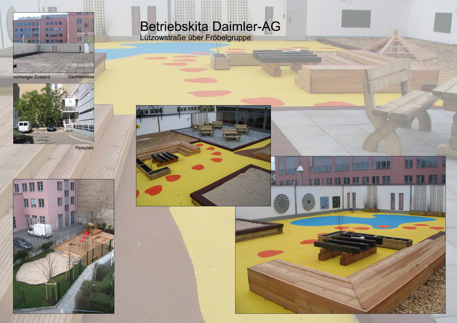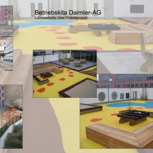 | Kurzbeschreibung | Freiraumplanung der Spielflächen der Betriebskita Daimler AG, Berlin, Dachterrasse 1. Bauabschnitt Spielflächen mit Dachterrasse; 2. Bauabschnitt mit Verkehrsgarten |