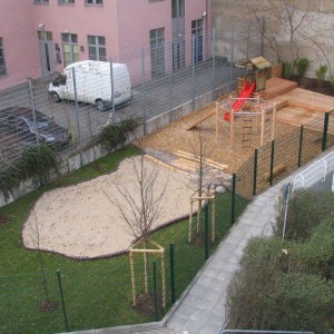 Die ebenerdige Spielfläche wurde notwendig um den entsprechenden Freiflächenfaktor pro betreutes Kind nachzuweisen. Hier haben wir eine vorhandene Parkplatzfläche aufgelöst und in einen Spielbereich mit unterschiedlichen Funktionen, wie z. B. Klettern, Krabbeln, Sandkastenspiel und Hüpfen umgestaltet.