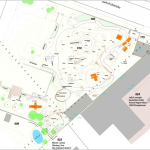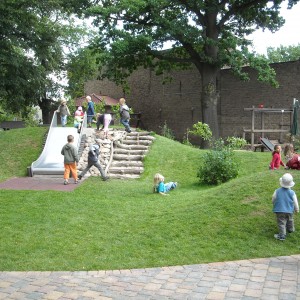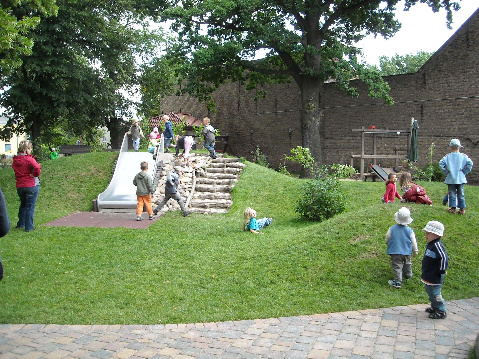 Gemeinsam wurden in wenigen, effektiven Gesprächen Ideen für eine Fantasielandschaft entwickelt, in der bewegte Geländemodellierungen Räume für unterschiedlichste Aktivitäten erzeugen. Diese so genannten „Spielhügel“ werden durch eine Bobbycarbahn eingefasst, die sich unter den alten Bäumen entlang schlängelt und alte Spielgeräte wieder neu in Szene setzt. Ein Theaterspielplatz mit Sitzen aus Holz, Stein und Rasen krönt die Hügel, ein Balancierpfad verbindet die unterschiedlichen Spielbereiche miteinander.