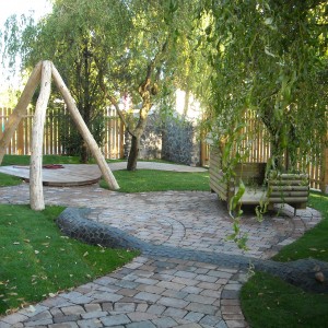 Der sonnige Gartenteil wird durch dichte Gebüsche gegliedert, in denen sich Trampelpfade bilden dürfen. Er führt über einen Wasserspielplatz bis zu einem romantischen Fort aus Robinienstangen mit angedeuteter Zugbrücke. Eine Szene, die an Harry Potter erinnert.