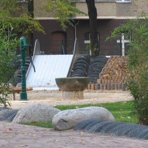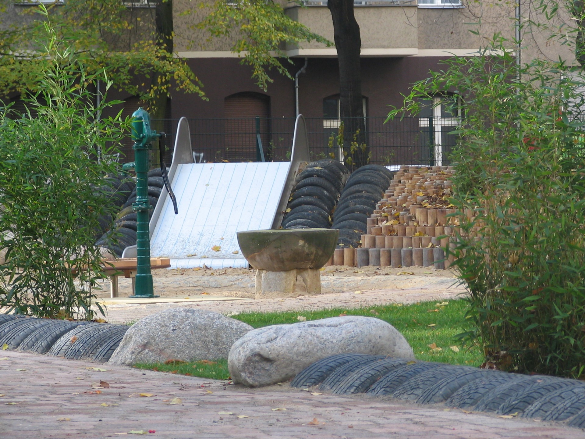 Auf relativ engem Raum sollten räumlich und funktional verschiedene Erlebnisberei-che geschaffen werden, die sich gegenseitig durchdringen. Dies gelang über ein zentrales Thema: Eine Bobbycar-Bahn. Die Bahn ist am Scheitelpunkt um 1,30 m er-höht und führt in / um das Oval einer Sandspielfläche, die durch eine Klettersteinbö-schung, einen Reifenwald und eine Holzpflockfläche abgegrenzt ist.