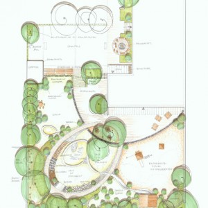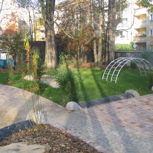 Den notwendigen Sichtschutz zum öffentlichen Straßenraum schaffen wellig angelegte Pfahlreihen aus Lärchenholz. Als robuste Neupflanzungen wurde u.a. Bambus verwendet, der auch intensiven Beanspruchungen über die Jahre hinweg stand hält.