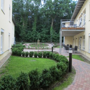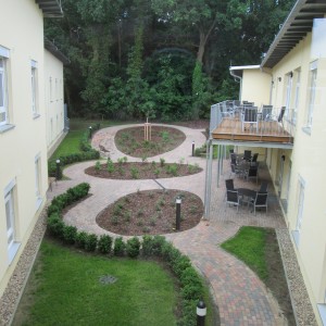 Gestaltungsprinzip ist der Raum, der nur durch Beete (hohe, niedrige) akzentuiert wird und somit eher zu einer platzartigen Wegeführung strebt. Die Möglichkeit, ununterbrochener Laufrichtungen zu folgen, unterstützt das therapeutische Konzept der Demenzbetreuung. Kniehohe Hecken aus Buchs bilden die Grenzlinie zu den Rasenflächen unter den Zimmerfenstern. Das soziale Konzept der Integration aller Bewohner wird so auch im Freiraum deutlich. Einzelterrassen gibt es nicht, alles trifft sich in den Höfen, die so zu Gemeinschaftsräumen werden.