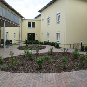 Diese Bauweise bietet ideale Voraussetzungen für die Gestaltung von lebenswerten Innenhöfen unter-schiedlicher Funktion und Atmosphäre. Der große Innenhof im Eingangsbereich dient der gemeinschaft-lichen Freiterrasse, er ist das „Cafe“ im Garten. Die halbrunden Linien der Pflaster- und Pflanzflächen durchziehen alle Gartenbereiche und gestalten einen mit Hochbeeten gegliederten weiten Hof im Wes-ten sowie eine engeren Hof im Osten.