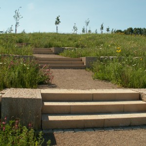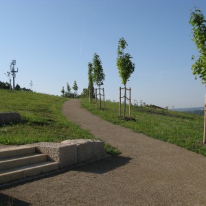 Der Stadtteilpark liegt auf der Kuppe des zum Leinetal geneigten Geländes und weist in sich einen Höhenunterschied von ca. 12 m auf. Hangparallele Wege mit langen Schleifen erschließen den Park, so dass die Kuppe auch behindertengerecht erreichbar ist. In kurzen Wegen, wird der Höhenunterschied durch jeweils zweistufige Natursteintreppenanlagen überwunden,. Die Bauweise der Treppenstufen wurde so gewählt, dass sie in ihrer Ansicht wie die Abfolge von niedrigen Steinrippen wirken, die einen Hang terrassieren. Alle Wege münden auf der Kuppe in einen Kreis mit einem Durchmesser von 12 m, der mit markanten Natursteinblöcken als Sitzbänken umrahmt wird.