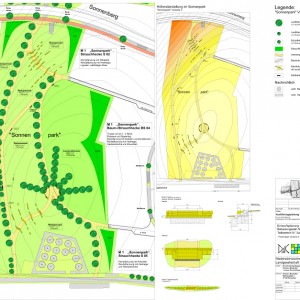 Die Bepflanzung beschränkt sich auf wegebegleitende Baumreihen mit großkronigen Bäumen (Sommerlinde und Walnüssen) und abschnittsweise kleinkronigen Bäumen (hier Elsbeere und Speierling). Von dem runden Sitzplatz auf der Kuppe weisen Baumlinien strahlenförmig in das freie Gelände und thematisieren den Namen „Sonnenpark“. Die großen Wiesenflächen sind mit Saatgutmischungen unterschiedlich hoher Krautanteile angesät.